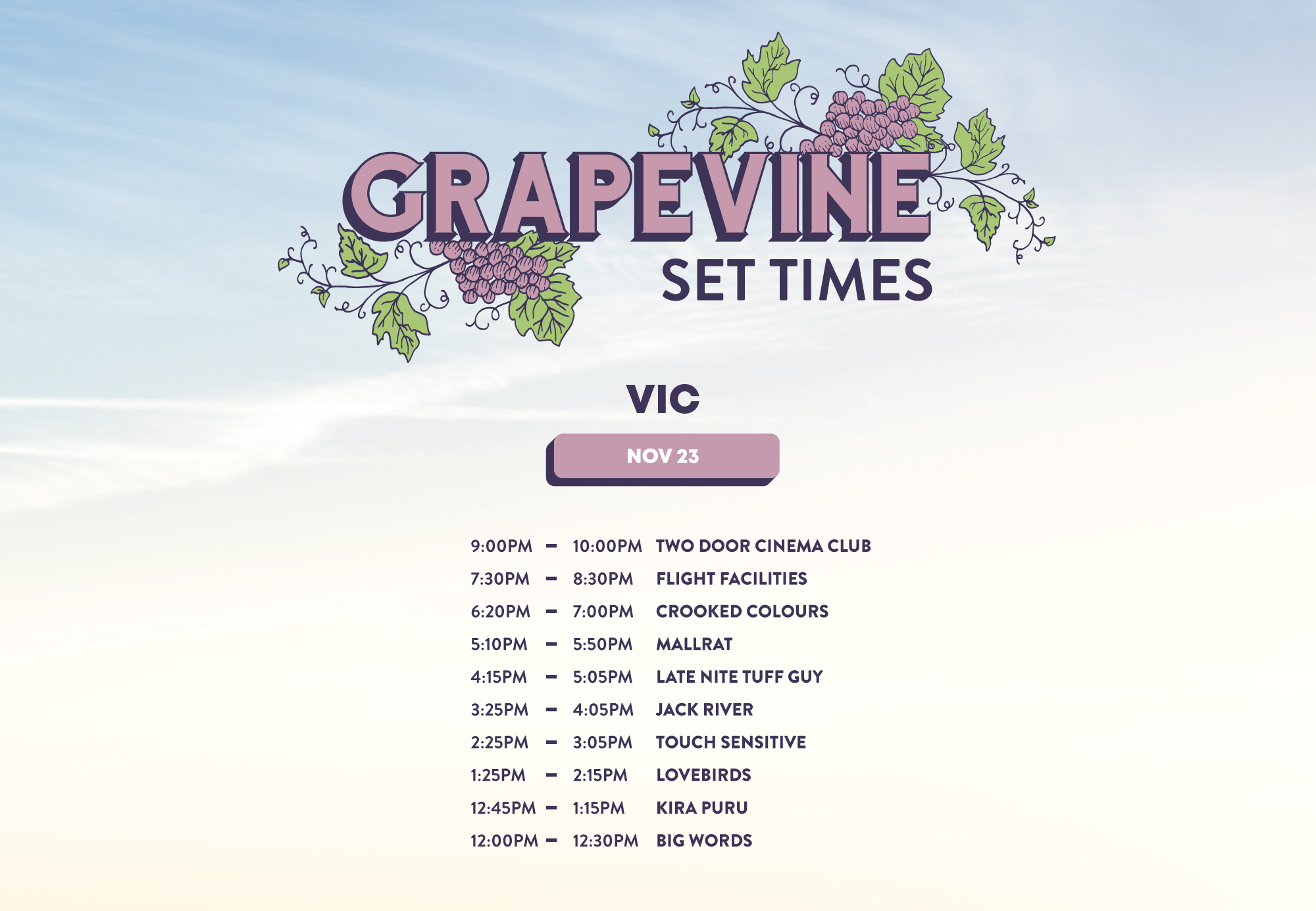 It is recommended that you have another form of transport organised for the end of event. Due to the location of Grapevine, there will not be many taxis/Ubers available.